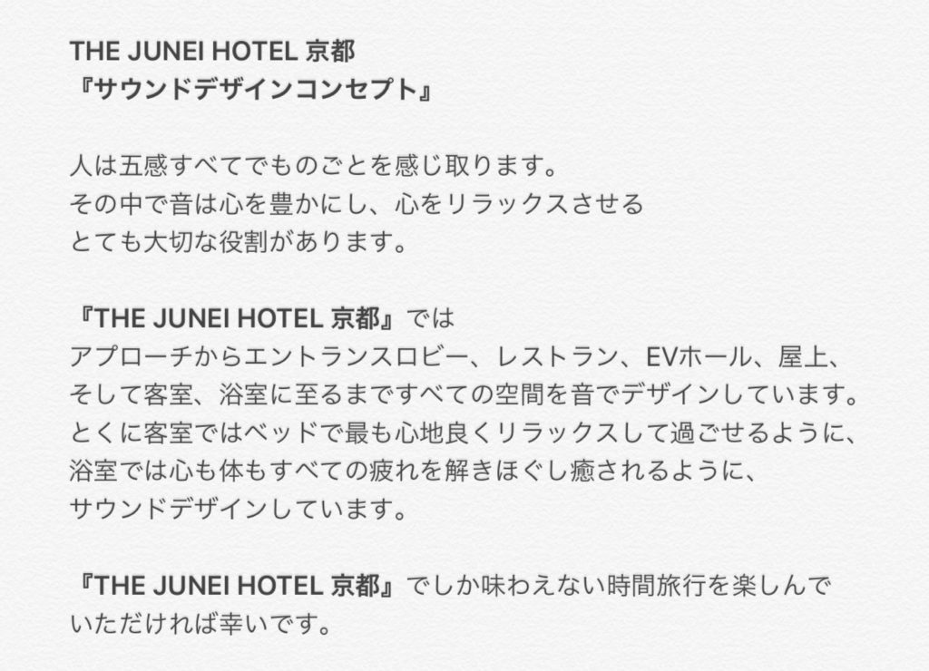 THE JUNEI HOTEL KYOTO 2020.11.15プロデュース事例一覧, 音と香りの空間デザイン事例 THE JUNEI HOTEL KYOTO (京都府 東山・御所西) 空間音響デザインを担当させていただきました。 京都 御所西 2020年 world luxury hotel awards 受賞 2020年 traveler reader’s awards 受賞 投稿者: one and only Inc. プロデュース事例一覧, 音と香りの空間デザイン事例 熱川プリンスホテル フレンチレストラン・ウェディング古我邸 関連記事一覧 フレンチレストラン・ウェディング古我邸 中国料理 新香港(xin xiang gana) サンリヤン相模原ステーションヴィラ 渓谷に佇む隠れ宿 峡泉